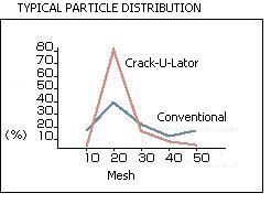 are currently in operation. Rather than crushing or grinding, the Roll Granulator literally cracks the material into a uniform, narrow range of particle size through a series of patented corrugated rolls. This unique roll surface applies a linear stress in the circumferential direction to the particles being fed into it. Each peak on the roll acts as a fulcrum point to particles bridged across the corrugation of the mating roll. Succeeding sets of rolls are arranged with narrower gap clearance and steeper pitch. As a result, particles smaller than the gap clearance can pass through, while those that are large, are cracked before passing through. Unlike conventional grinders or roller mills that rely on facial compression or friction, the Roll Granulator employs only local stress cracking, thus minimizing the problems of over grinding, abrasion, excess heat-up of roll surface and rapid wear of rolls. |